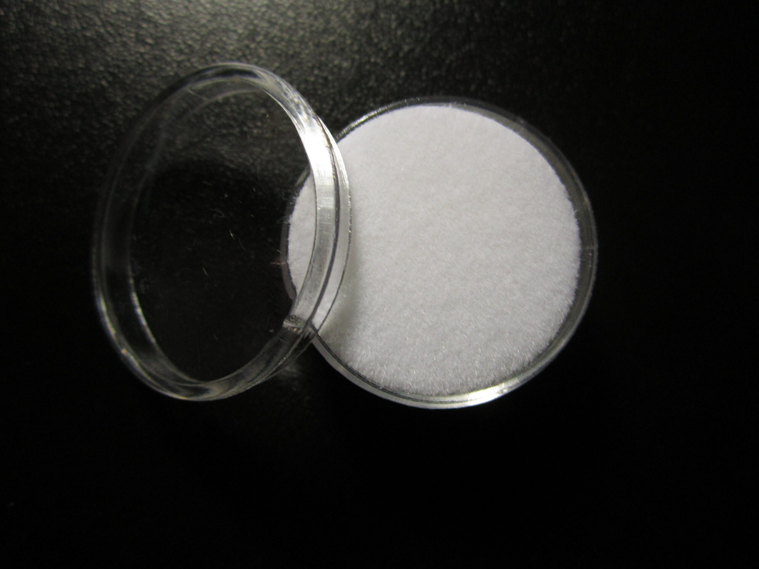 1 Boîte de Gemmologie ronde et transparente avec couvercle bombé.Dimensions : 2.5 x 2.5 cm. Velours Blanc.