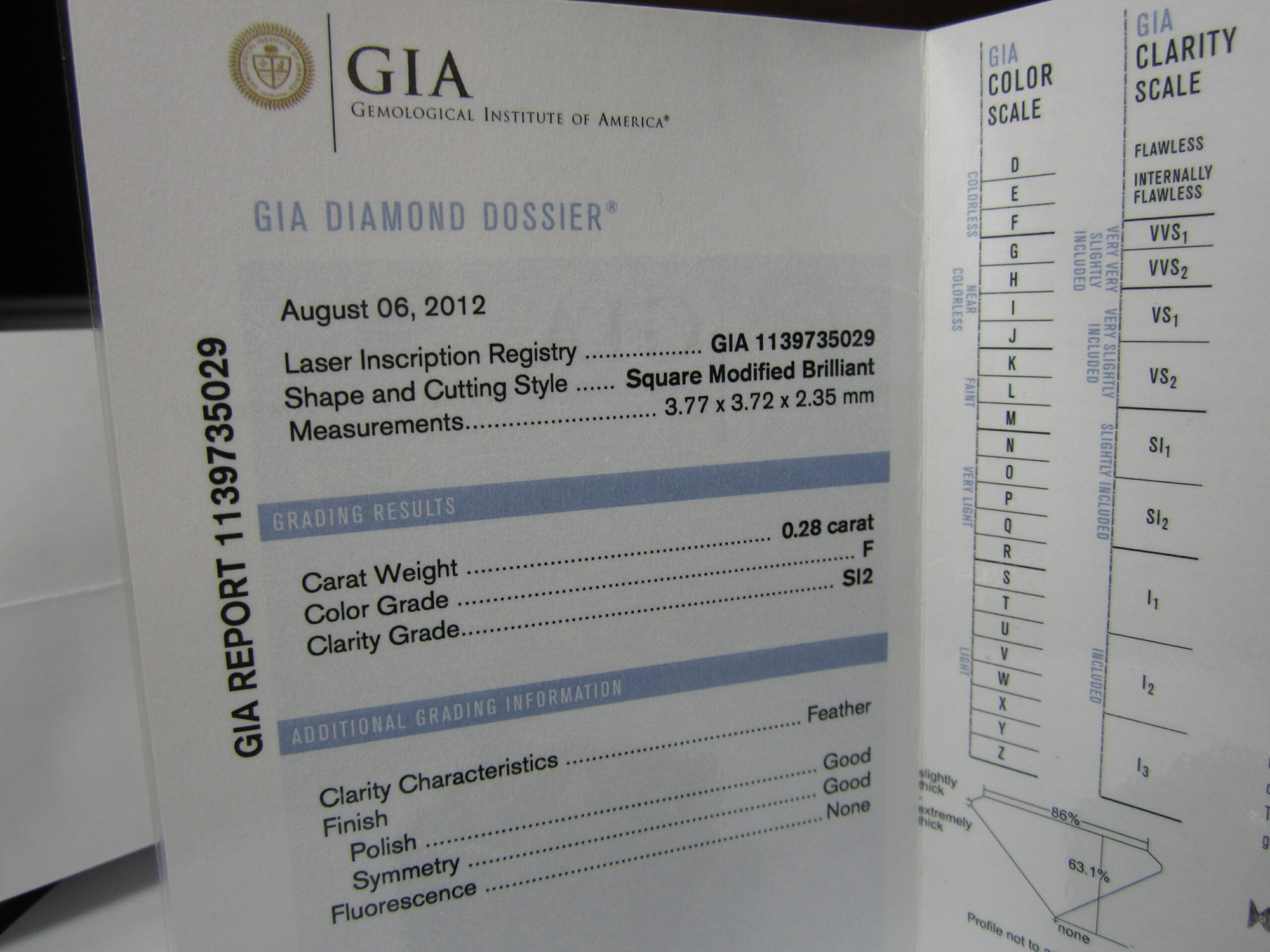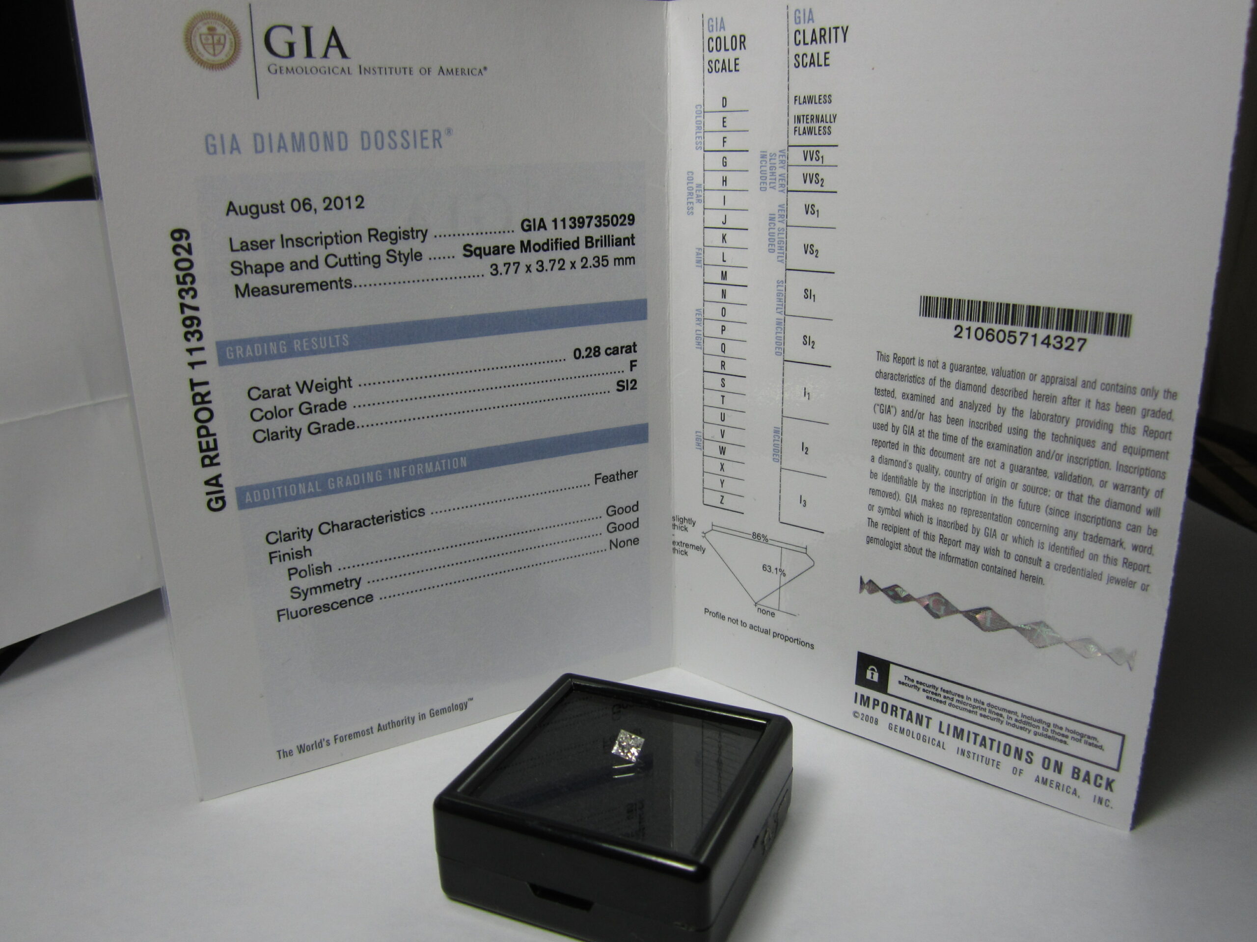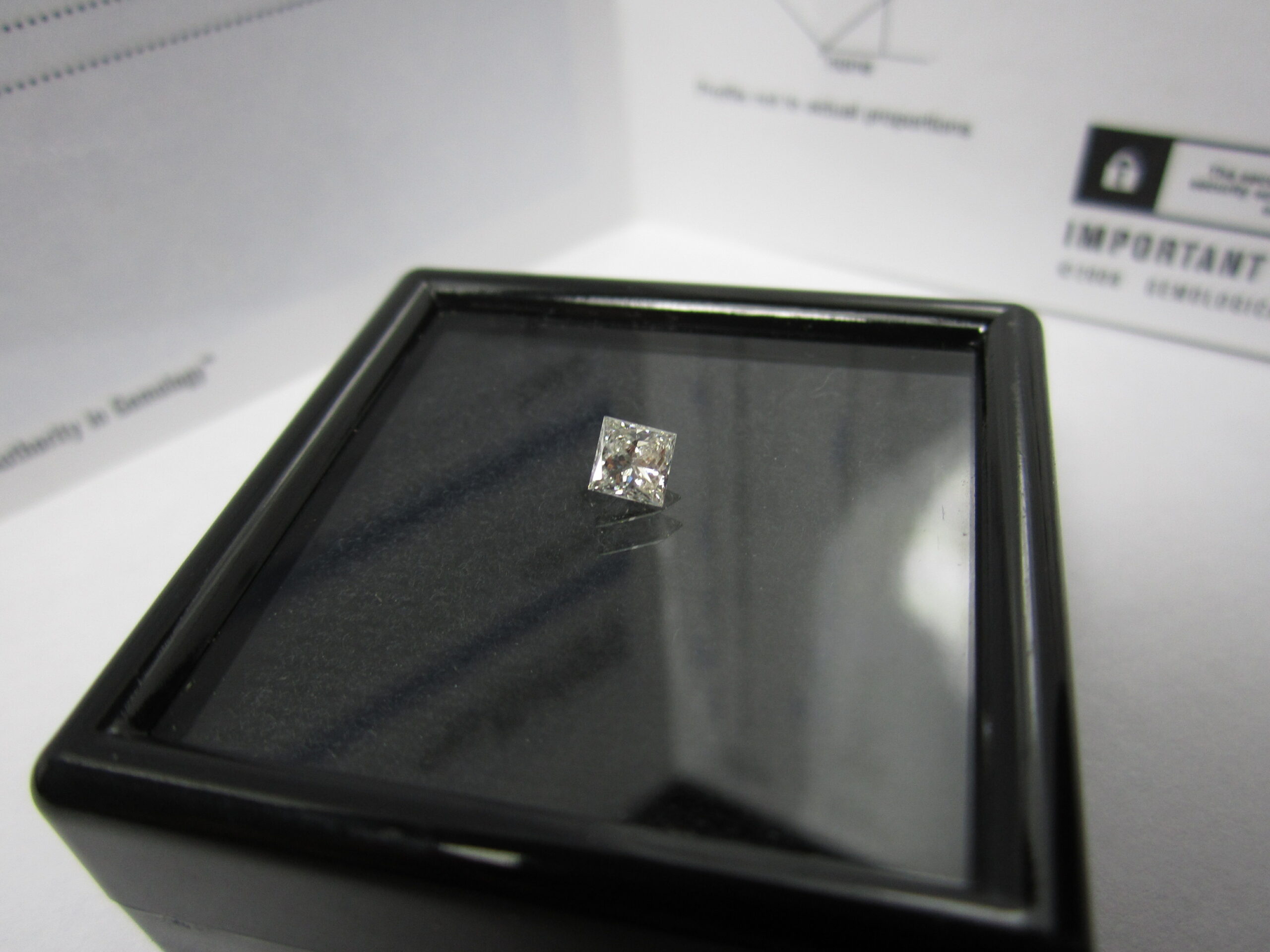 Diamant – taille princesse, F, SI2, 0,28 carat, G / G / None